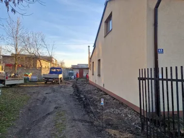 Budynek gminny przy ul. Kościuszki 43 został niedawno podłączony do miejskiej sieci ciepłowniczej, a związane z tym roboty ziemne pozostawiły po sobie miejscami trudne do przejścia fragmenty dojścia. Gmina zleciła ich uporządkowanie i utwardzenie nawierzchni. Zadanie realizowane jest już w terenie, a jego wartość wynosi 26 900 zł. Celem jest przywrócenie wygodnego i bezpiecznego dostępu do klatki schodowej, szczególnie po opadach deszczu.