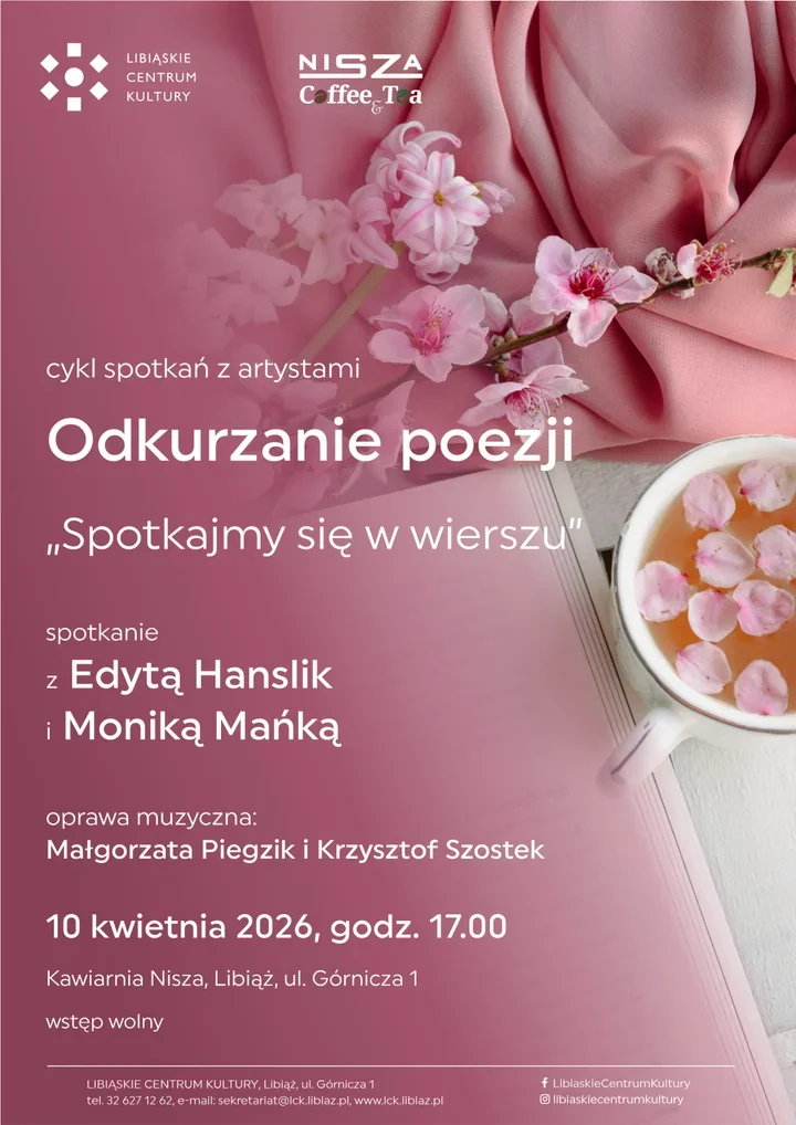 Wydarzenie odbędzie się 10 kwietnia 2026 o godz. 17.00 w kawiarni Nisza - to tu Libiąskie Centrum Kultury zaprasza na popołudniową ucztę dla zmysłów. Wstęp wolny - bez biletu, bez formalności.