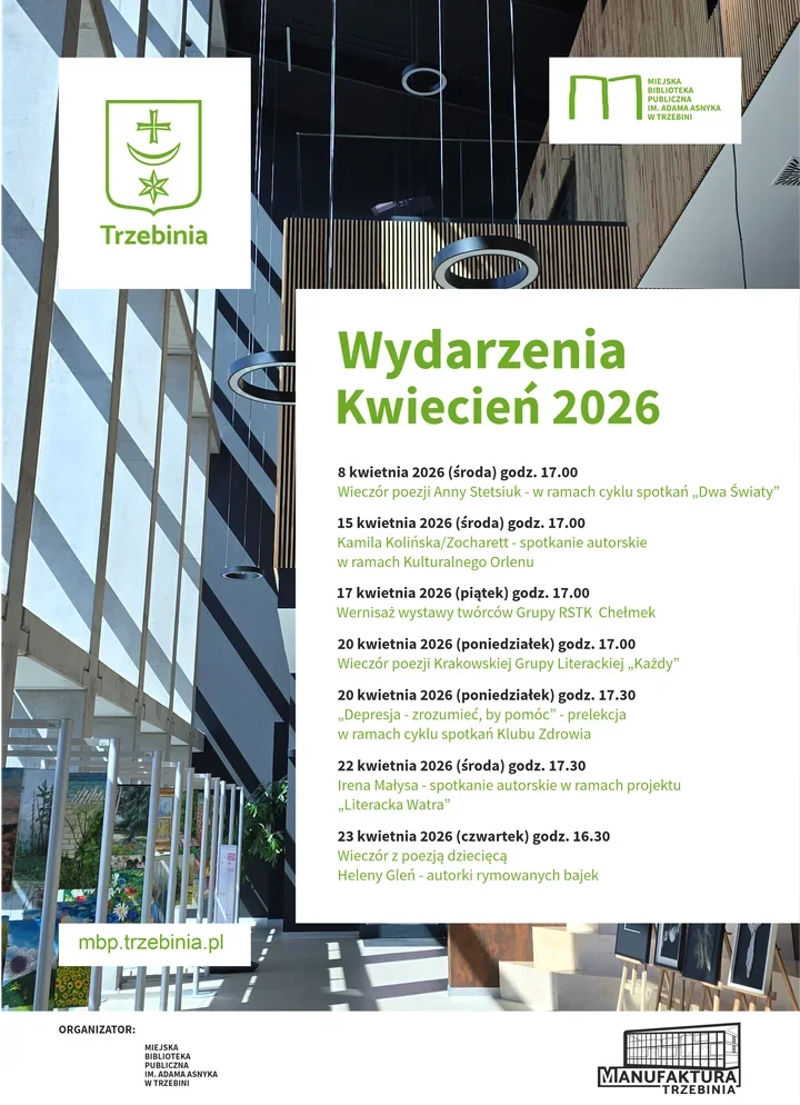 W Manufakturze kwiecień zapowiada się jak miesiąc, w którym spokojnie można przejść od literatury do sztuki, a potem jeszcze do rozmowy o zdrowiu. W kalendarzu pojawiają się nazwiska dobrze znane miłośnikom książek i wydarzeń kulturalnych, więc mieszkańcy mają kilka powodów, by zajrzeć tu więcej niż raz 📚