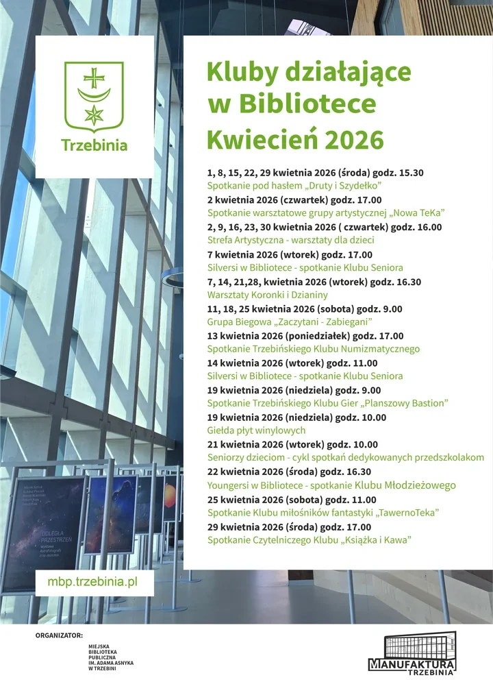 Pełny wykaz kwietniowych spotkań bibliotecznych klubów i spotkań cyklicznych można sprawdzić na plakacie. Tam właśnie układa się cały ten spokojny, ale bardzo różnorodny biblioteczny miesiąc.