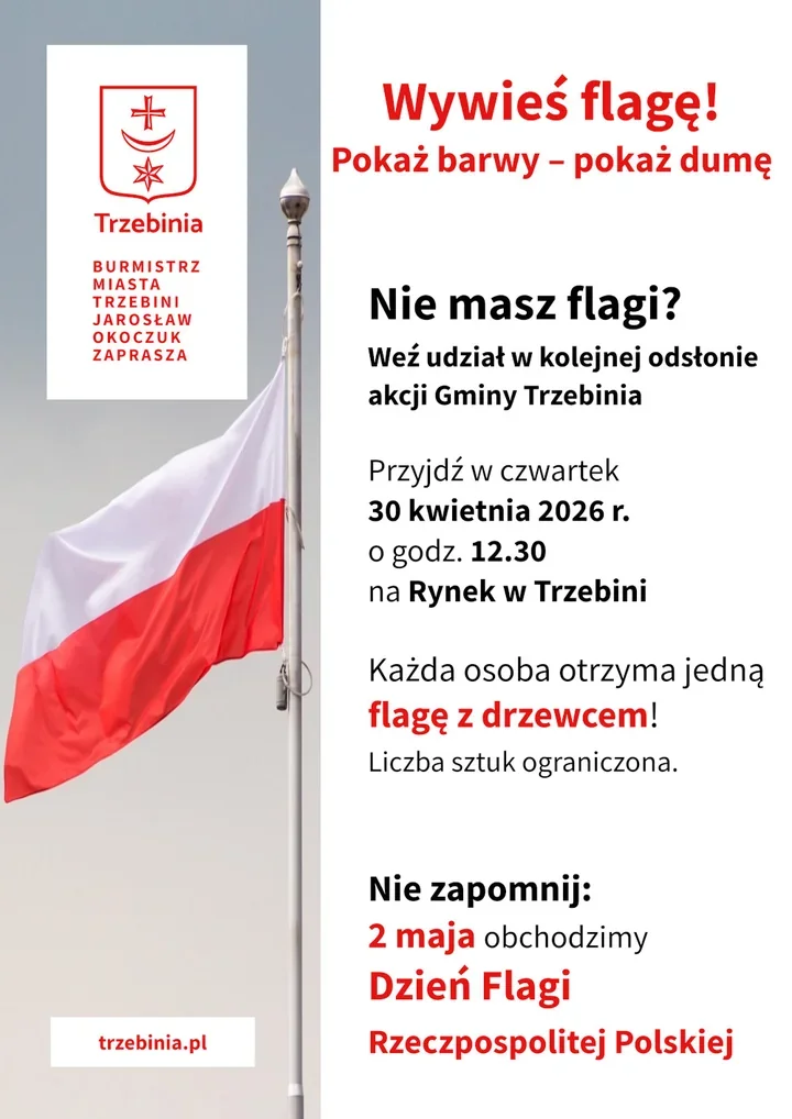 Flagi będzie można odebrać 30 kwietnia 2026 roku o godz. 12:30 na Rynku w Trzebini. Rozdawać je ma burmistrz Jarosław Okoczuk. Liczba egzemplarzy jest ograniczona, więc kto chce zdobyć własną flagę, powinien pojawić się na miejscu wcześniej.