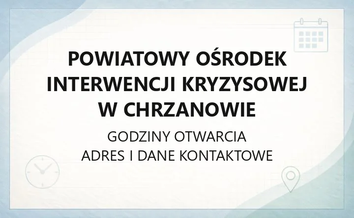 - Aktualne dane na temat godzin przyjęć i pracy Ośrodka dostępne są na oficjalnej stronie Powiatowego Ośrodka Interwencji Kryzysowej w Chrzanowie.