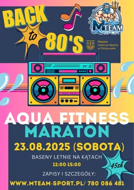 4. edycja maratonu aqua fitness zaplanowana jest jako trzygodzinne wydarzenie łączące ćwiczenia w wodzie z muzyką i retro klimatem lat 80. Zajęcia odbywać się będą na basenie miejskim i przeznaczone są dla osób zainteresowanych aktywnością w wodzie — zarówno dla regularnie ćwiczących, jak i dla tych, którzy chcą spróbować treningu w lżejszej, wodnej formule.
